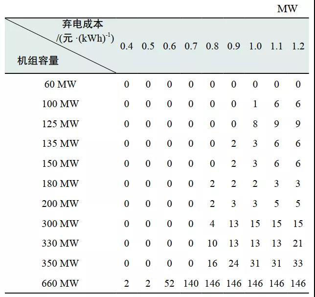 文章基于北方某區(qū)域電網(wǎng)實(shí)際數(shù)據(jù)構(gòu)建了包含11臺不同容量的火電機(jī)組和一處等效風(fēng)電場的算例系統(tǒng)。假定不同單位棄電量成本下進(jìn)行規(guī)劃計算,得到11臺機(jī)組的改造方案如表2所示。該結(jié)果說明改造容量分配方案基本滿足“大容量機(jī)組優(yōu)先”原則,660MW、350MW、330MW機(jī)組為主要改造機(jī)組。
