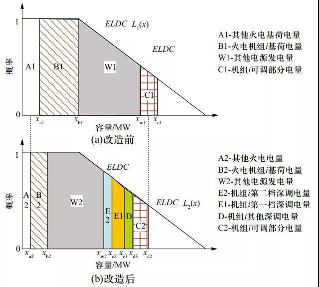? 圖2 火電機(jī)組靈活性改造前后生產(chǎn)模擬承擔(dān)負(fù)荷示意圖