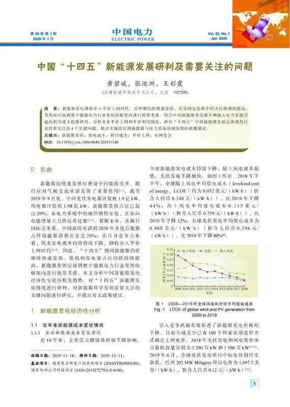 新能源發(fā)電即將步入平價上網(wǎng)時代,近中期仍將快速發(fā)展,在全網(wǎng)總裝機中的占比將繼續(xù)提高,其發(fā)展應(yīng)放到整個能源電力行業(yè)發(fā)展的框架內(nèi)進行統(tǒng)籌考慮。結(jié)合中國新能源發(fā)電成本和接入電力系統(tǒng)引起的利用成本趨勢研判,分析未來平價上網(wǎng)和平價利用情況,研究“十四五”中國新能源發(fā)展總體情況以及需要關(guān)注的4個關(guān)鍵問題,提出實現(xiàn)高比例新能源與電力系統(tǒng)協(xié)調(diào)發(fā)展的政策建議。