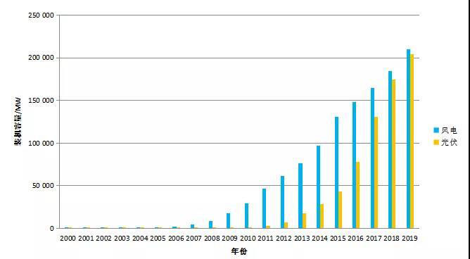 “十三五”時期,我國新能源發(fā)展成效顯著,裝機(jī)規(guī)模快速增長,開發(fā)布局不斷優(yōu)化,技術(shù)水平顯著提升,度電成本持續(xù)下降,政策體系逐步完善,新能源已經(jīng)從補(bǔ)充能源進(jìn)入到主力能源的發(fā)展階段。截至2019年末,全國風(fēng)電累計裝機(jī)21005萬千瓦,其中陸上風(fēng)電累計裝機(jī)20412萬千瓦、海上風(fēng)電累計裝機(jī)593萬千瓦;全國光伏發(fā)電累計裝機(jī)達(dá)到20430萬千瓦,其中集中式光伏14167萬千瓦,分布式光伏6263萬千瓦[1][2]。風(fēng)電和光伏發(fā)電裝機(jī)容量均實(shí)現(xiàn)“十三五”規(guī)劃目標(biāo)。