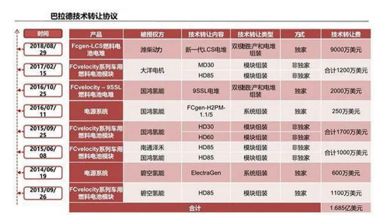 2013年起,巴拉德公司逐步授權(quán)多家中國(guó)公司燃料電池技術(shù)轉(zhuǎn)讓,在中國(guó)建立依賴自身技術(shù)的生產(chǎn)線,并向中國(guó)燃料電池汽車供應(yīng)巴拉德的產(chǎn)品。