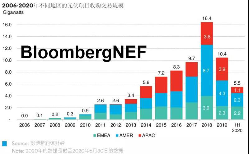 2019年在運光伏項目收購交易規(guī)模顯著低于2018年,主要因為美國市場2018年有幾宗規(guī)模較大的交易,而2019年美國光伏收購交易規(guī)模僅為2018年的一半,且歐洲市場的收購交易也出現(xiàn)放緩。2020年上半年的初步數(shù)據(jù)表明歐洲、中東和非洲地區(qū)的收購交易恢復勢頭強勁,上半年的收購交易規(guī)模已經達到2.2GW,超過去年全年的交易規(guī)模。