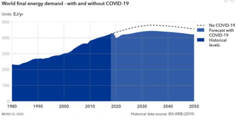 根據(jù)挪威DNV-GL公司最新發(fā)布的2020年能源轉(zhuǎn)型展望報(bào)告(Energy Transition Outlook),全球GDP在2020年將萎縮6%。即使經(jīng)濟(jì)增長(zhǎng)放慢,到本世紀(jì)中葉世界經(jīng)濟(jì)總量仍將是今天的兩倍。但2050年全球能源需求幾乎與2018年持平。這主要是由于能量強(qiáng)度的顯著提高,也與新冠疫情有關(guān)。