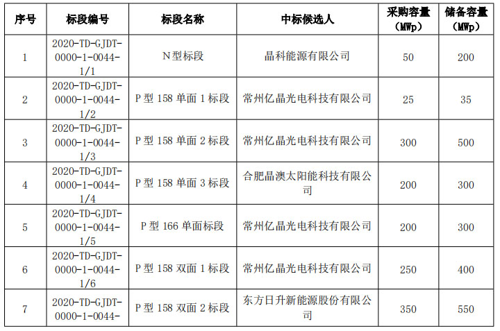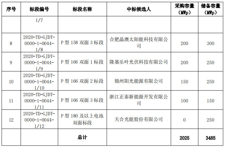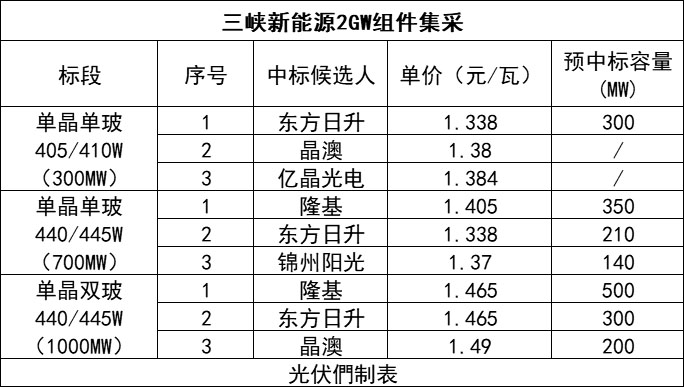 此外,在上周開(kāi)標(biāo)的中廣核集采中,其河北、安徽兩個(gè)標(biāo)段已經(jīng)公示了中標(biāo)候選人,其中河北標(biāo)段中標(biāo)企業(yè)為晶澳,單價(jià)1.55元/瓦,組件要求為單面445W;安徽區(qū)域標(biāo)段公示了三個(gè)中標(biāo)候選人,億晶、晶澳與隆基分別位列前三位中標(biāo)候選人,其單價(jià)分別為1.58、1.56以及1.65元/瓦,組件要求為440瓦單面。