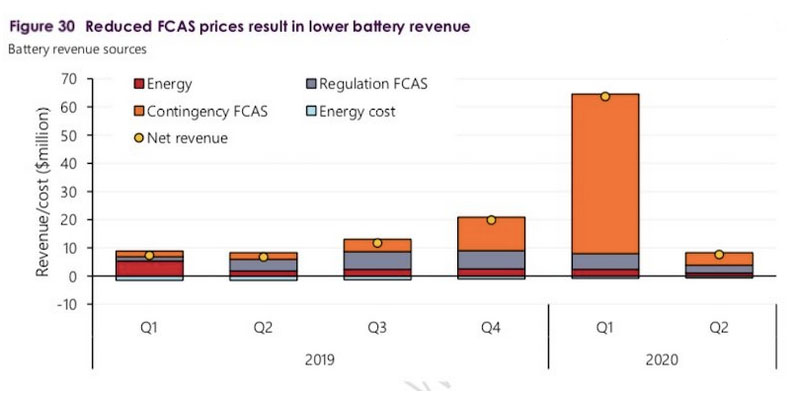 大型電池儲能系統(tǒng)為此獲得了豐厚的回報,但是盡管澳大利亞能源市場運營商(AEMO)為幫助管理電網(wǎng)而對頻率控制與輔助服務(wù)(FCAS)的需求急劇增加,但頻率控制與輔助服務(wù)(FCAS)的收入仍在第二季度急劇下降。
