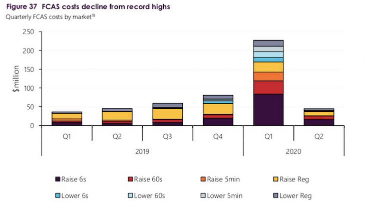 澳大利亞能源市場運營商(AEMO)指出,盡管頻率控制與輔助服務(wù)(FCAS)要求急劇增加(見上表),但其總成本(包括由化石燃料發(fā)電設(shè)施中的傳統(tǒng)供應(yīng)商交付的成本)仍從歷史最高點下降。