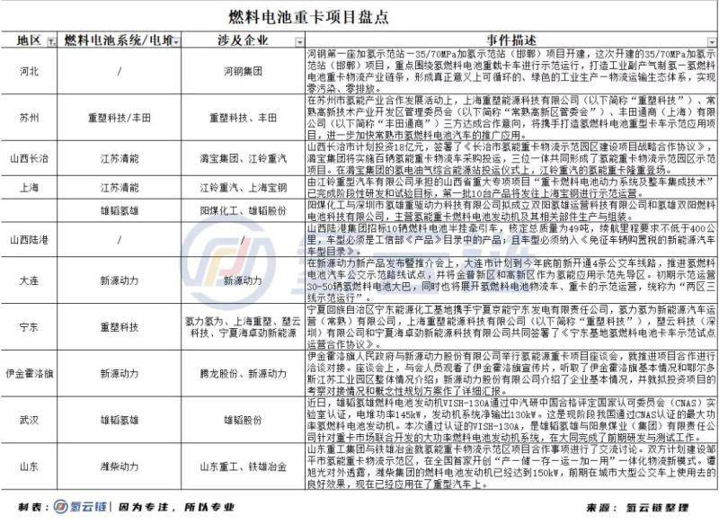表1 全國燃料電池重卡項(xiàng)目