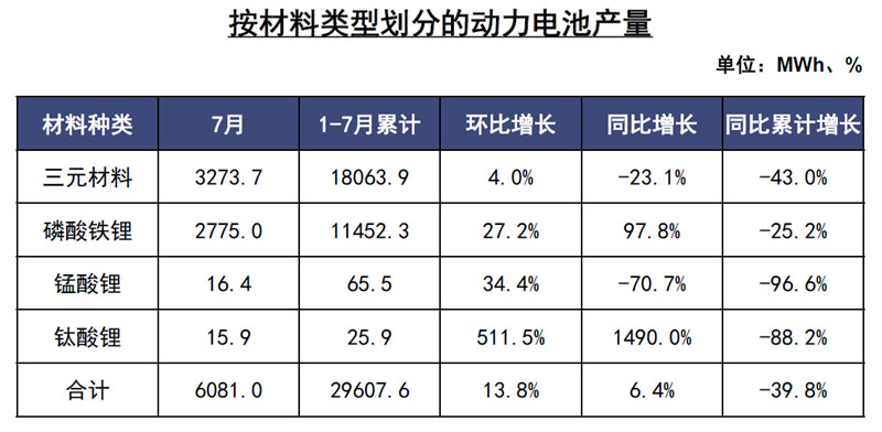 1-7月,我國(guó)動(dòng)力電池產(chǎn)量累計(jì)29.6GWh,同比累計(jì)下降39.8%。其中三元電池產(chǎn)量累計(jì)18.1GWh,占總產(chǎn)量61%,同比累計(jì)下降43.0%;磷酸鐵鋰電池產(chǎn)量累計(jì)11.5GWh,占總產(chǎn)量38.7%,同比累計(jì)下降25.2%。