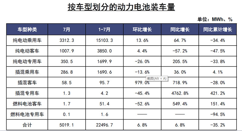 前7月,我國(guó)動(dòng)力電池裝車量累計(jì)22.5GWh,同比累計(jì)下降35.2%。其中三元電池裝車量累計(jì)15.9GWh,占總裝車量70.6%,同比累計(jì)下降32.2%;磷酸鐵鋰電池裝車量累計(jì)6.5GWh,占總裝車量28.8%,同比累計(jì)下降37.6%。