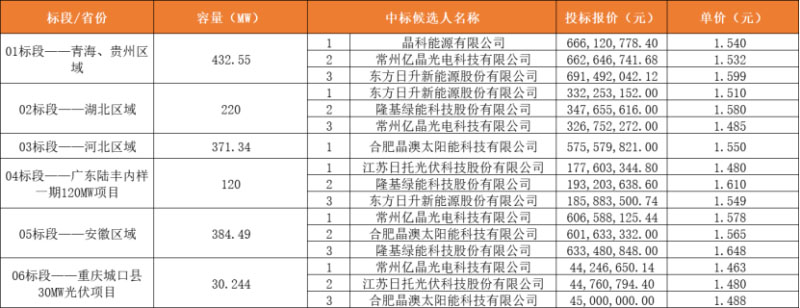在中廣核1.558GW的組件集采中,晶科(432.55MW)、東方日升(220MW)、晶澳(371.34MW)、日托(120MW),億晶擬中標兩個標段,共計414.734MW規(guī)模。光伏們匯總了6個標段組件中標候選人情況,具體中標結(jié)果詳見下表: