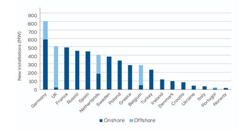 陸上風(fēng)電的安裝量(3.9GW)比前三年平均水平(3.7 GW)稍好一些。海上風(fēng)電的安裝量(1.2GW)則低于近三年的平均水平(1.5GW)。