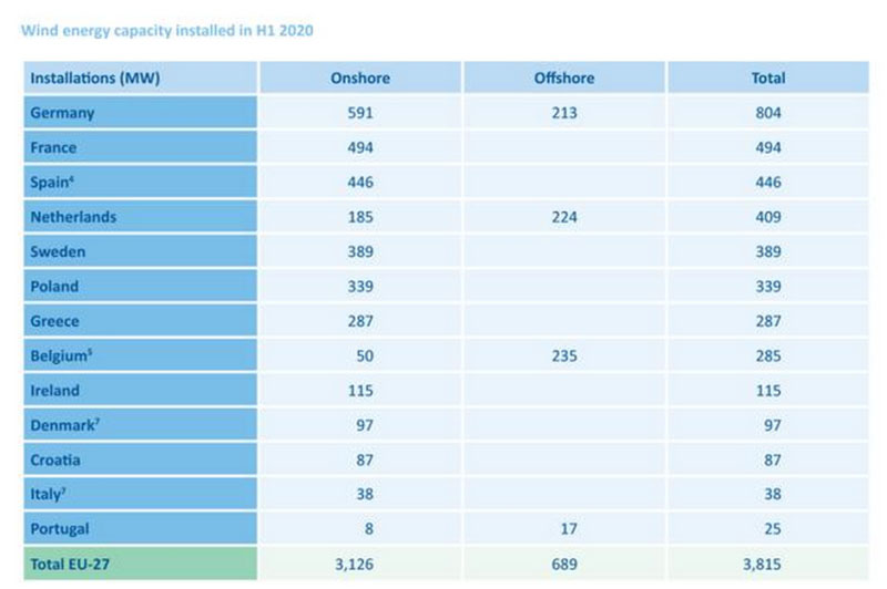 盡管風(fēng)能行業(yè)在上半年受到嚴(yán)重干擾,但裝機(jī)水平與前幾年相當(dāng)。 下表為2020年上半年歐洲各國(guó)裝機(jī)統(tǒng)計(jì)表。
