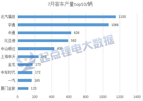 起點(diǎn)研究院(SPIR)數(shù)據(jù)顯示,7月新能源汽車裝機(jī)量約為9.57萬輛,同比增長30.2%,環(huán)比增長4.7%。其中客車產(chǎn)量為5553輛,產(chǎn)量排名前十的企業(yè)分別是北汽福田、宇通、中通、比亞迪、中山順達(dá)、上海申沃、金龍、中車時(shí)代、一汽和廈門金旅,如下圖所示: