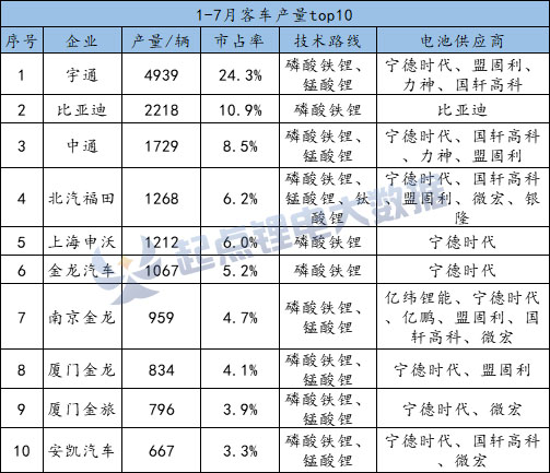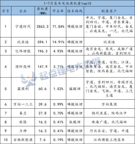 7月客車配套電池企業(yè)共有10家,分別是寧德時(shí)代、比亞迪、國軒高科、億緯鋰能、銀隆、盟固利、微宏動(dòng)力、力神、安馳新能源和蕪湖天弋,其中僅寧德時(shí)代一家占比67.8%。