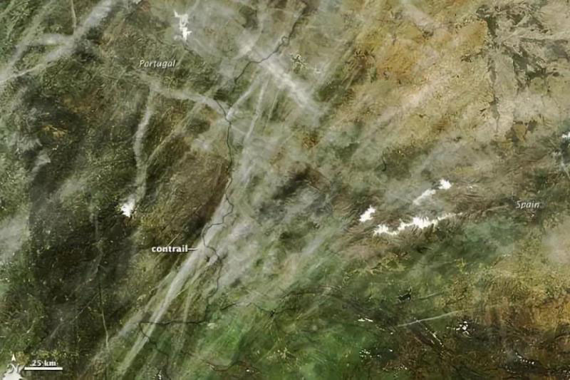 (2013年NASA-Terra衛(wèi)星拍攝了葡萄牙和西班牙縱橫交錯的航跡云)