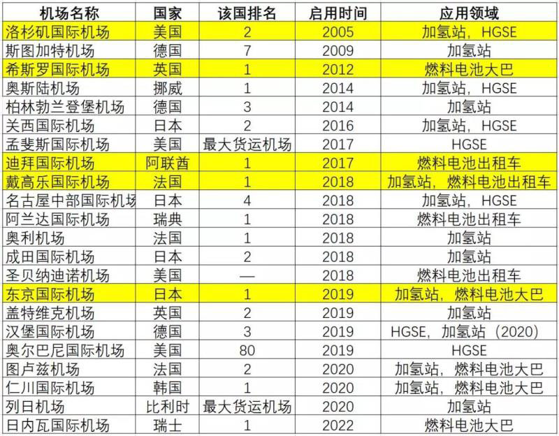 (作者統(tǒng)計,標黃為全球TOP10機場,HGSE指氫能地面支持設備)