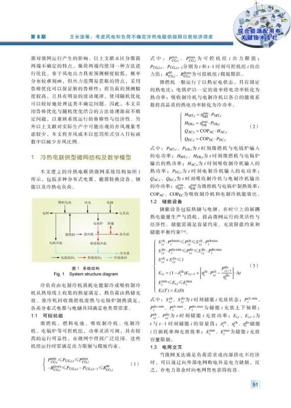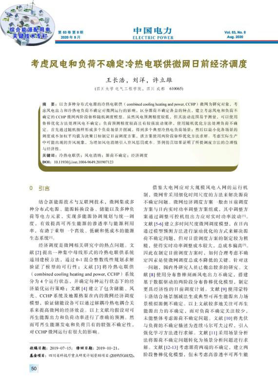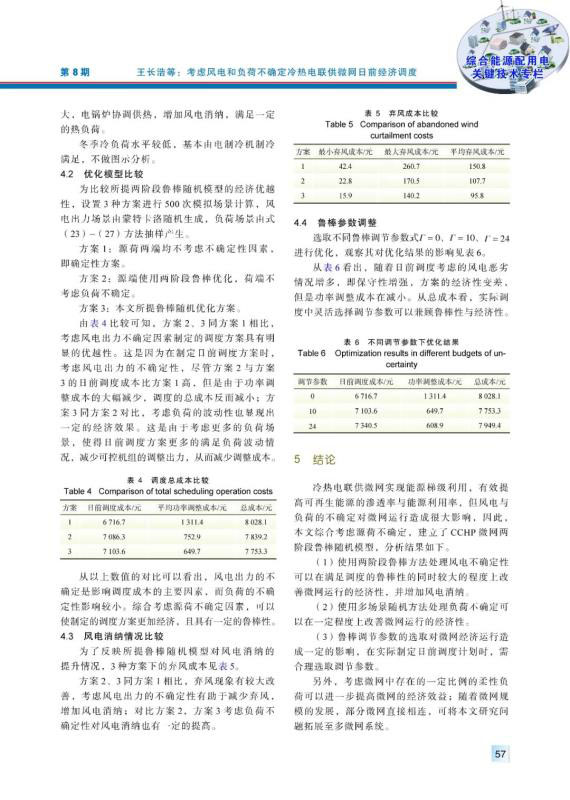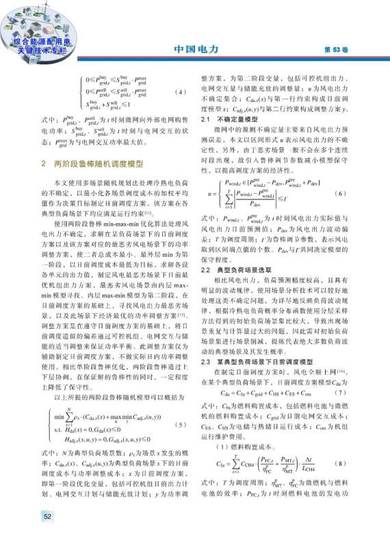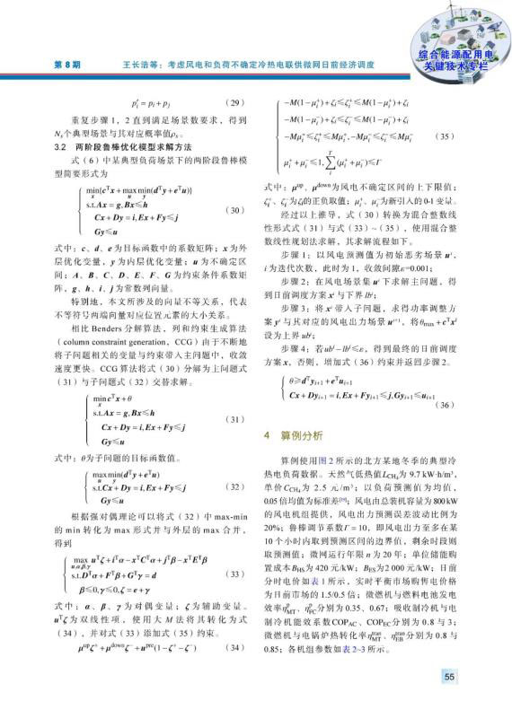 以含多種分布式電源的冷熱電聯(lián)供(combined cooling heating and power, CCHP)微網(wǎng)為研究對象,考慮風(fēng)電出力和冷熱電負(fù)荷不確定對微網(wǎng)運(yùn)行的影響,區(qū)分源荷不確定各自的特點(diǎn),建立考慮風(fēng)電和負(fù)荷不確定的CCHP微網(wǎng)兩階段魯棒隨機(jī)調(diào)度模型。雖然風(fēng)電預(yù)測精度較低,但其波動范圍易于測量,可以使用魯棒優(yōu)化方法處理風(fēng)電不確定;負(fù)荷預(yù)測精度較高且有較強(qiáng)波動規(guī)律,使用隨機(jī)優(yōu)化方法處理負(fù)荷不確定。首先通過隨機(jī)抽樣形成多個負(fù)荷場景并削減,得到多個典型冷熱電負(fù)荷場景;然后以最小化各場景的調(diào)度成本加權(quán)平均值為決策目標(biāo)制定日前調(diào)度方案,該方案使用兩階段魯棒優(yōu)化方法求解??紤]實(shí)際生產(chǎn)中可能出現(xiàn)的棄風(fēng)現(xiàn)象,為增加風(fēng)電消納引入棄風(fēng)懲罰成本。算例仿真結(jié)果證明了所提調(diào)度方法的合理性與經(jīng)濟(jì)性。
