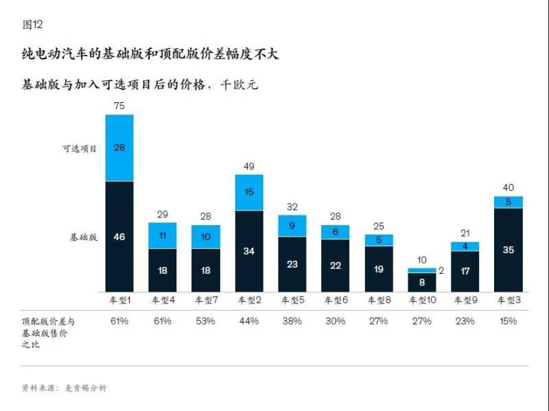 這10款車型中的7款從基礎(chǔ)版到頂配版的價(jià)差幅度不超過(guò)50%(圖12)。10款中有5款提供方案以外的電池或發(fā)動(dòng)機(jī)升級(jí),有三款提供更昂貴的車身選擇,比如顏色和輪轂。由此來(lái)看,在定價(jià)策略或非硬件收入方面(例如無(wú)線軟件更新)似乎存在著有待挖掘的收入潛能。總之,國(guó)際汽車廠商可將我們的研究發(fā)現(xiàn)視為簡(jiǎn)化產(chǎn)品組合或?qū)で蟛町惢膮⒖?,尤其是?dāng)它們考慮進(jìn)入中國(guó)市場(chǎng)時(shí)。