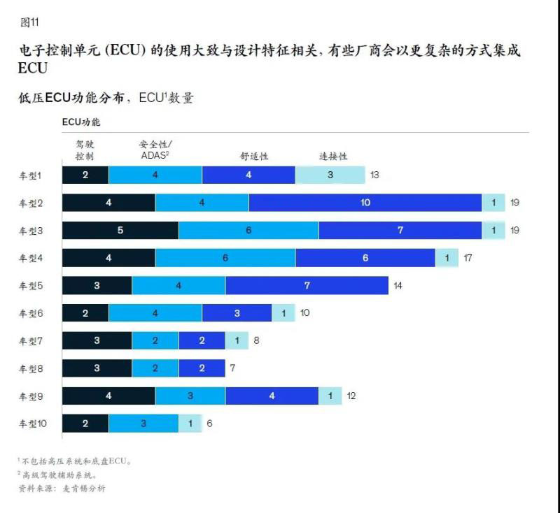 電子電氣架構(gòu)。本次對(duì)標(biāo)測(cè)試顯示,在具備相似功能的車型之間,低壓線束的重量各有不同。這表明在電子電氣架構(gòu)中存在重大的設(shè)計(jì)和成本優(yōu)化空間。與此類似,參與此次測(cè)試的廠商各自選擇了不同的ADAS9功能,采用了不同的電子控制單元(ECU)集成設(shè)計(jì),所使用的ECU數(shù)量也各不相同。這些車型裝配了6~19個(gè)分散式ECU(圖11)。一個(gè)潛在的發(fā)展方向是將所有功能集成在單一汽車控制器中,如美國(guó)一家純電動(dòng)汽車廠商的做法。藉此,廠商或可以相對(duì)較低的成本實(shí)現(xiàn)性能提升,但這需要大量研發(fā)投資,以及先進(jìn)的內(nèi)部軟件開(kāi)發(fā)能力。