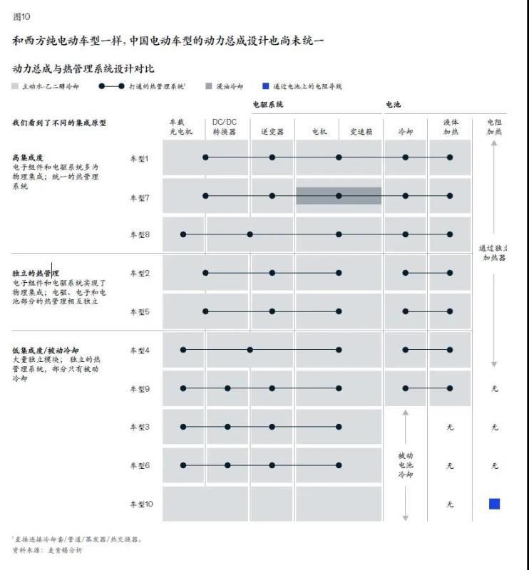 此外,物理集成度也各不相同。只有三個(gè)車型顯示了較高的集成水平:電子組件和電氣驅(qū)動(dòng)系統(tǒng)實(shí)現(xiàn)了物理集成,且熱管理系統(tǒng)涵蓋了所有組件。另有兩個(gè)車型顯示出相同的物理集成水平,但電驅(qū)系統(tǒng)和電池部分的熱管理系統(tǒng)是分離的。其余車型使用了較少集成組件:?jiǎn)为?dú)的電氣模塊和單獨(dú)的熱管理。其中三個(gè)車型使用了被動(dòng)風(fēng)冷方式,此類車型相比使用電池水冷技術(shù)的車型,充電速度受限(圖10)。