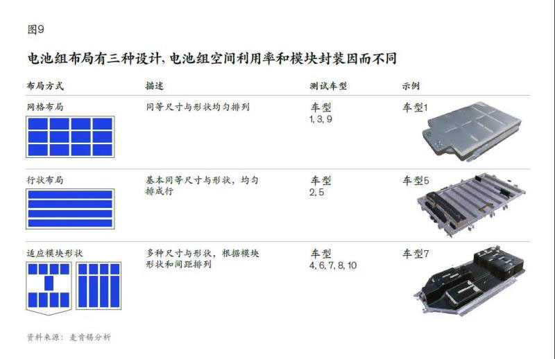 動(dòng)力總成。此次對(duì)標(biāo)分析揭示出各種各樣的動(dòng)力總成設(shè)計(jì)理念,包括電池布局、熱管理設(shè)計(jì)與布線,以及動(dòng)力系統(tǒng)模塊集成。我們的3-D模型顯示一半的車型使用了網(wǎng)格和行狀的電池組布局,這增加了空間利用率,同時(shí),這種布局相比多尺寸電池模組,減少了封裝變化,可降低模組生產(chǎn)成本(圖9)。