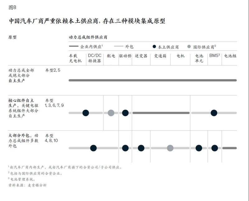 就推進(jìn)產(chǎn)業(yè)化而言,當(dāng)前的供應(yīng)商生態(tài)系統(tǒng)加速了產(chǎn)品上市。中國(guó)在電機(jī)生產(chǎn)、半導(dǎo)體、電子產(chǎn)品,尤其是電池方面的長(zhǎng)期積累,使得本地公司有能力提供電動(dòng)汽車動(dòng)力總成系統(tǒng)所需的所有零部件(圖8)。由于垂直整合水平各異,汽車廠商通過(guò)本地供應(yīng)商采購(gòu)的動(dòng)力總成系統(tǒng)零部件比例在45%~100%之間。