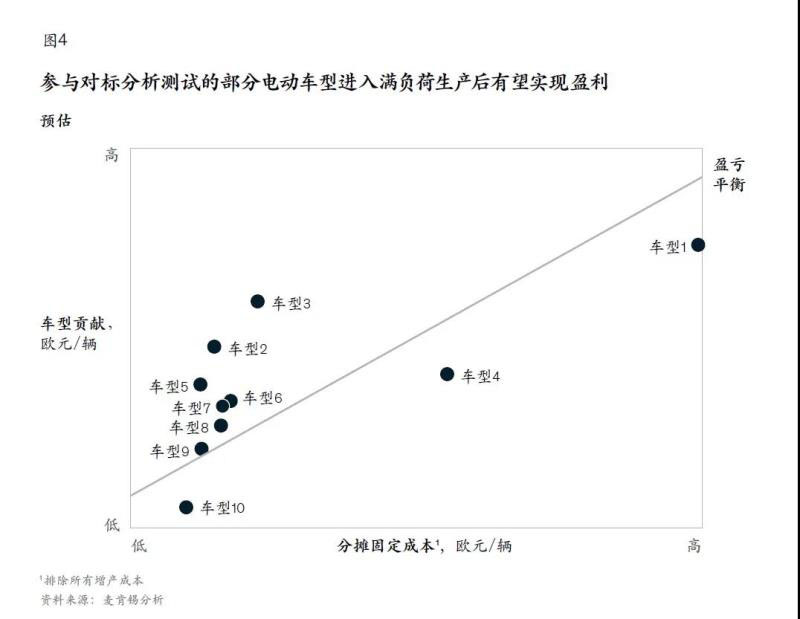 我們基于逾25萬(wàn)個(gè)數(shù)據(jù)點(diǎn)對(duì)物料和生產(chǎn)成本進(jìn)行了估算。結(jié)果表明,10個(gè)車型中有9個(gè)都能達(dá)到中等或以上水平的邊際貢獻(xiàn)率,最高可達(dá)50%。不過(guò),當(dāng)我們將保修、營(yíng)銷成本、一般性成本及管理費(fèi)用、研發(fā)、資本支出納入考量之后,我們估計(jì)營(yíng)業(yè)利潤(rùn)率依然為正的車型將減少(圖4)。固定成本的巨大差異可能源自多重因素,比如整合深度、采購(gòu)策略差異、廠商總產(chǎn)量等。