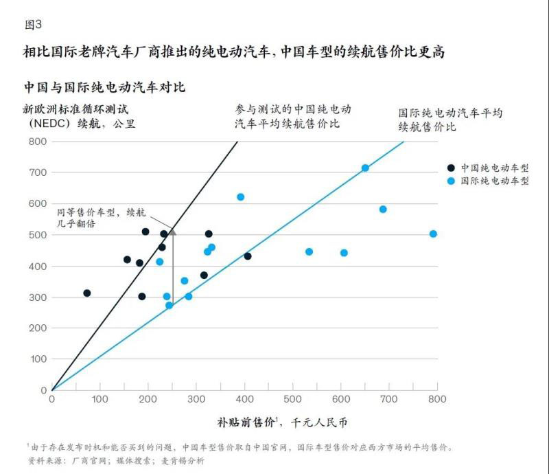 參與對(duì)標(biāo)分析的所有車型的絕對(duì)續(xù)航時(shí)間和動(dòng)力均不亞于歐、美、日同類車型,而在續(xù)航售價(jià)比方面則更勝一籌(圖3)。參加測(cè)試的中國(guó)純電動(dòng)汽車的續(xù)航里程幾乎是同價(jià)位國(guó)際車型的兩倍。