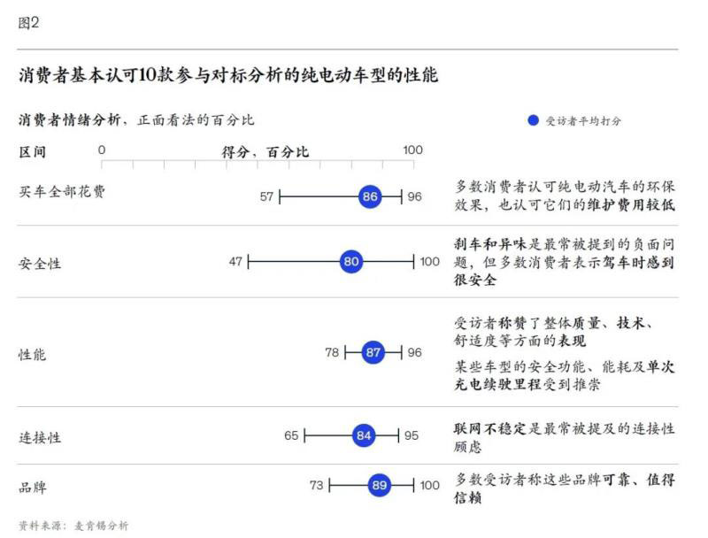許多專為中國(guó)消費(fèi)者設(shè)計(jì)的新車型促進(jìn)了純電動(dòng)汽車增長(zhǎng),2019年,愿意考慮純電動(dòng)汽車的消費(fèi)者比率高達(dá)80%。針對(duì)10種對(duì)標(biāo)車型的消費(fèi)者態(tài)度分析顯示,消費(fèi)者的平均認(rèn)可率達(dá)到85%,反映出所有汽車廠商都能根據(jù)客戶需求量身定制產(chǎn)品(圖2)。