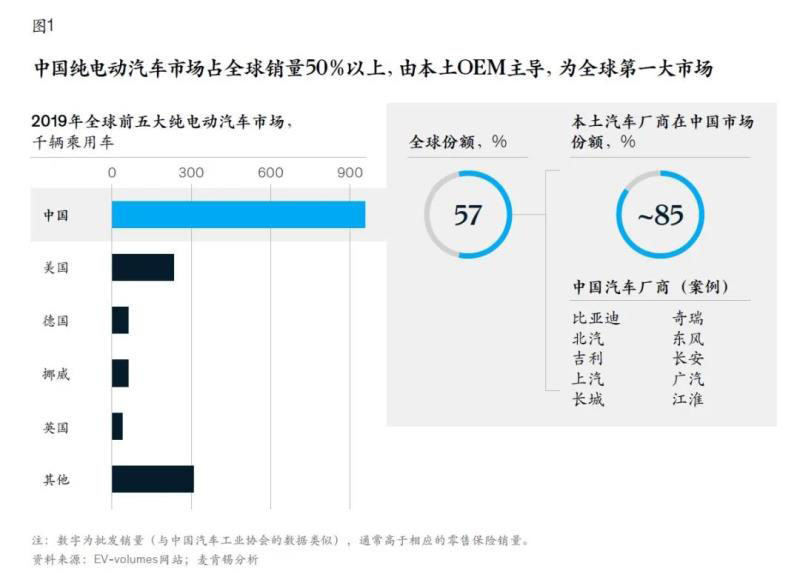 中國(guó)汽車市場(chǎng)是全球汽車業(yè)最大的利潤(rùn)池,貢獻(xiàn)了全球總利潤(rùn)的1/3(約400億美元)。如今,這個(gè)市場(chǎng)正轉(zhuǎn)向電動(dòng)出行。2014-2019年間,純電動(dòng)汽車在中國(guó)的銷量每年增長(zhǎng)80%。2019年中國(guó)的純電動(dòng)汽車銷量超過(guò)了90萬(wàn)輛,全球售出的純電動(dòng)汽車當(dāng)中,有57%是在中國(guó)市場(chǎng)售出的,使中國(guó)當(dāng)仁不讓成為全球最大的純電動(dòng)汽車市場(chǎng)。而從OEM市場(chǎng)份額來(lái)看,中國(guó)廠商幾乎完全壟斷了這個(gè)市場(chǎng)。2019年,國(guó)際汽車廠商在純電動(dòng)汽車市場(chǎng)年銷售量中僅占15%的份額(圖1)。