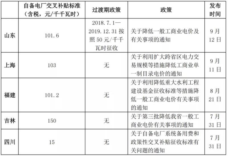 除此之外,山東、上海、福建、吉林和四川等五省市已分別出臺相關(guān)辦法,確定了自備電廠交叉補貼標準。