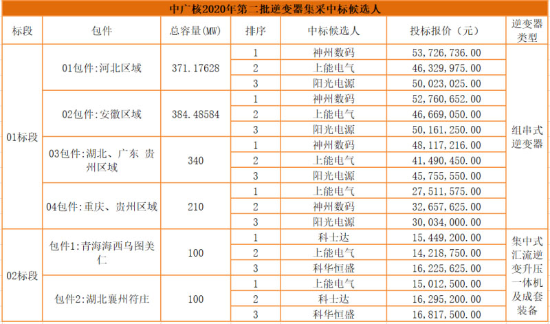 8月19日,中廣核新能源2020年第二批逆變器集采中標(biāo)候選人公布。01標(biāo)段共包括4個(gè)包件,其中包件01、02、03第一中標(biāo)候選人均為神州數(shù)碼(深圳)有限公司(華為),包件04第一中標(biāo)候選人為上能電氣。