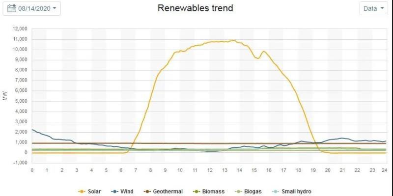 圖3 加州8月14日可再生能源電力供應(yīng)實時構(gòu)成圖