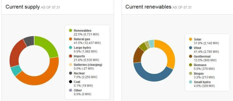 圖1 加州8月20日7:31和18:50電力供應(yīng)實時結(jié)構(gòu)圖