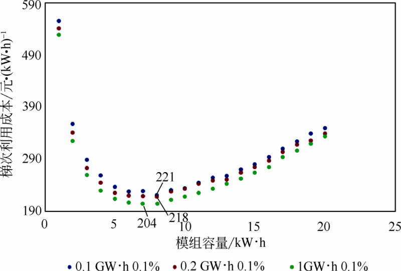 圖6對(duì)比了3種電芯損壞率下(0.01%、0.1%、1%)不同模組容量退役電池的梯次利用成本變化情況。研究發(fā)現(xiàn)電芯損壞率對(duì)成本下降有較為明顯的影響,當(dāng)損壞率低至0.01%后,單位千瓦時(shí)電池梯次利用成本為157元/(kW·h),比損壞率1%的情況低50%。此外我們也發(fā)現(xiàn)不同電芯損壞率下最低梯次利用成本所對(duì)應(yīng)的模組容量也各不相同,例如0.01%損壞率對(duì)應(yīng)的最優(yōu)模組容量為16 kW·h,而1%損壞率對(duì)應(yīng)3 kW·h。