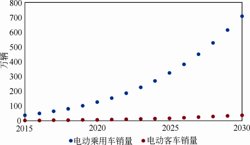 目前國內(nèi)市場(chǎng)上動(dòng)力乘用車電池容量一般在20~60 kW·h,大型客車電池容量普遍高于200 kW·h。隨著動(dòng)力電池技術(shù)的進(jìn)步未來電池比能量還將不斷提升。根據(jù)日本新能源產(chǎn)業(yè)綜合開發(fā)機(jī)構(gòu)(NEDO)的預(yù)測(cè),到2030年全固態(tài)聚合物電池、鋰硫電池和鋰空氣電池將成為主流的車用動(dòng)力電池技術(shù),比能量將達(dá)到500 W·h/kg;美國能源部預(yù)測(cè)電動(dòng)汽車技術(shù)的動(dòng)力電池比能量應(yīng)達(dá)到800 W·h/kg,以滿足550公里續(xù)航目標(biāo)。在我國,國務(wù)院曾在2012年提出到2020年比能量達(dá)到300 W·h/kg的動(dòng)力電池發(fā)展目標(biāo);電動(dòng)汽車百人會(huì)則預(yù)測(cè)到2020年,動(dòng)力電池比能量達(dá)到350 W·h/kg,2030年達(dá)到500 W·h/kg。
