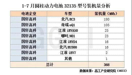 2020年1-7月圓柱動力電池32135裝機量約0.37GWh,同比下降53%。目前該型號動力電池僅國軒高科有配套裝機,電池系統(tǒng)能量密度最高為140.24Wh/kg,配套裝機在江淮iEV7車型上。
