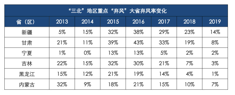 因?yàn)殡娋W(wǎng)必須實(shí)時(shí)平衡,因電網(wǎng)消納能力不足而被迫放棄的風(fēng)電,稱(chēng)為“棄風(fēng)”。2015年前后,三北地區(qū)的風(fēng)電大基地由于外送通道短缺、當(dāng)?shù)叵{不足,棄風(fēng)率達(dá)到峰值,平均棄風(fēng)率超過(guò)20%,部分地區(qū)棄風(fēng)率一度接近100%。