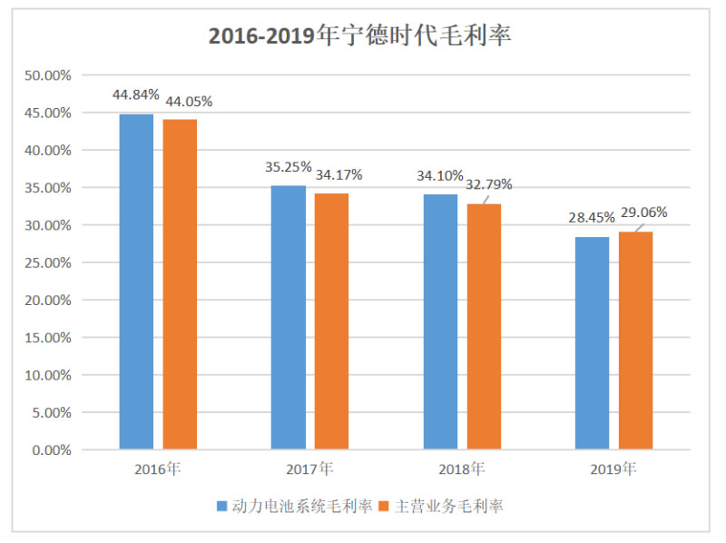 寧德時(shí)代IPO前的招股書(shū)和年報(bào)披露的數(shù)據(jù)顯示,從2016年到2019年,其動(dòng)力電池系統(tǒng)業(yè)務(wù)毛利率和主營(yíng)業(yè)務(wù)毛利率處于持續(xù)下滑狀態(tài),動(dòng)力電池系統(tǒng)業(yè)務(wù)毛利率從2016年的44.84%降至2019年的28.45%,主營(yíng)業(yè)務(wù)毛利率從2016年的44.05%降至2019年的29.06%。
