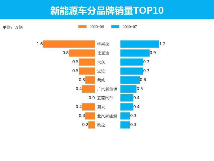 從品牌角度來看,7月新能源車銷量最高的五個品牌分別為特斯拉、比亞迪、大眾、寶駿、榮威,其銷量分別為1.2萬輛、0.9萬輛、0.7萬輛、0.7萬輛、0.6萬輛,占新能源車當(dāng)月銷售總量的46.4%。造車新勢力受到了新能源汽車快速發(fā)展的影響,品牌產(chǎn)品更具個性化且科技含量更高,吸引了一部分消費者的關(guān)注,對傳統(tǒng)新能源生產(chǎn)廠商產(chǎn)生了一定的沖擊。