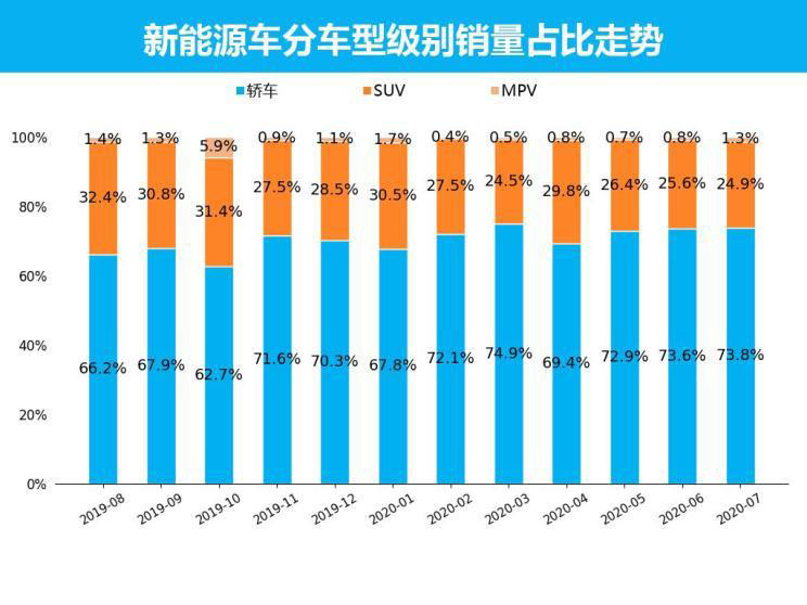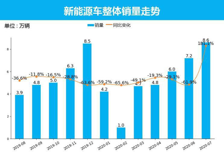 從整體新能源市場銷量情況來看,2020年7月,新能源車共銷售了8.6萬輛,占整個市場銷量的5.3%。與上個月相比,新能源車銷量環(huán)比增長18.2%,與去年同期相比,新能源車銷量同比上漲181.1%。
