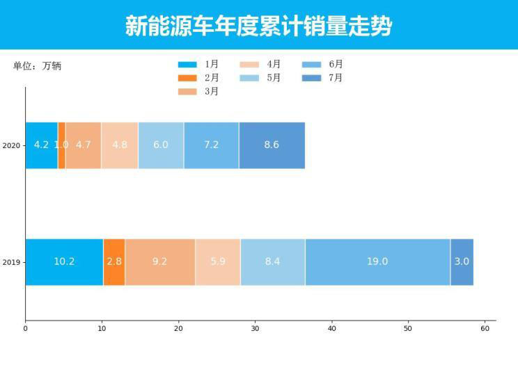 從累計銷量數(shù)據(jù)來看,2020年1-7月,新能源車?yán)塾嬩N量為36.3萬輛,同比累計下跌37.9個百分點,較去年同期相比,新能源車?yán)塾嬩N量有所下跌。同上個月累計變化相比,變化比1-6月累計提高12個百分點。