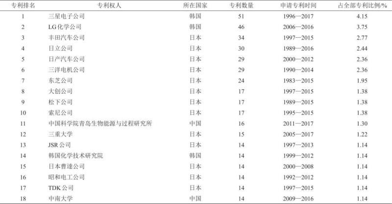 統(tǒng)計到2017年底,全固態(tài)聚合物電解質(zhì)所涉及的專利數(shù)量共有1228件。從近幾年的技術(shù)熱點來看,搖椅式電池相關(guān)的專利最近三年(2015—2017年)的專利申請量達到其專利總量的36.51%,表明該技術(shù)領(lǐng)域的發(fā)展較快。