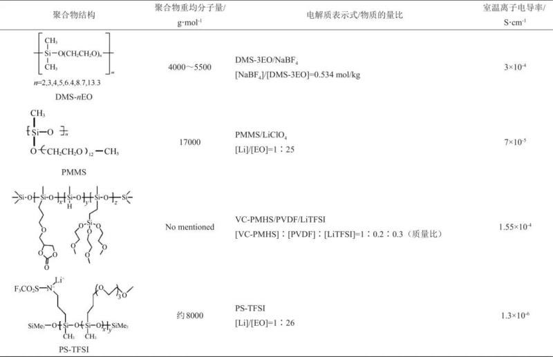 不同于聚環(huán)氧乙烷,聚硅氧烷尺寸熱穩(wěn)定性好,不容易燃燒,并且其玻璃化轉(zhuǎn)變溫度較低,因此制備得到的全固態(tài)聚合物電解質(zhì)安全性更高,室溫離子傳導(dǎo)更容易。相關(guān)聚硅氧烷基全固態(tài)聚合物電解質(zhì)的相關(guān)性質(zhì)列于表1。