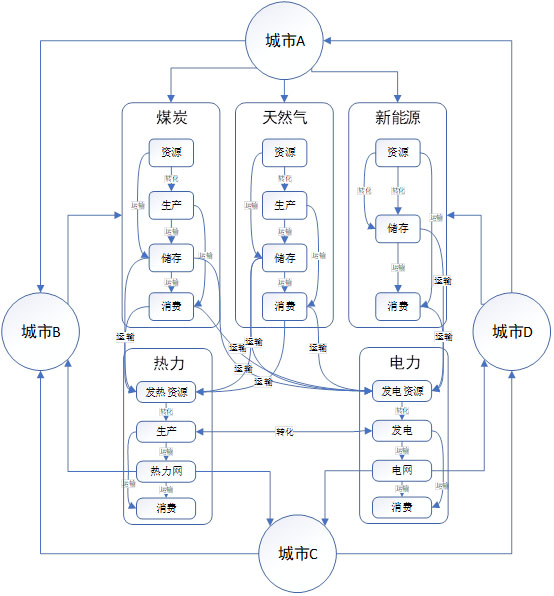 立足生態(tài)文明建設(shè),能源系統(tǒng)正逐步向綠色發(fā)展轉(zhuǎn)變,就是要發(fā)揮電力能源樞紐的作用,推動能源的綠色轉(zhuǎn)型和清潔生產(chǎn),提供優(yōu)質(zhì)、多樣化的能源服務(wù),從而促進(jìn)社會的綠色轉(zhuǎn)型和可持續(xù)發(fā)展,最終實(shí)現(xiàn)生態(tài)文明社會。綜合能源系統(tǒng)是指在規(guī)劃、建設(shè)、運(yùn)營過程中,對能源的生產(chǎn)、輸配、轉(zhuǎn)換、儲存等環(huán)節(jié)進(jìn)行有機(jī)協(xié)調(diào)和優(yōu)化,形成的多能源、全鏈條的一體化系統(tǒng),城市群綜合能源系統(tǒng)是基于城市資源和負(fù)荷特性的差異,適應(yīng)不同城市發(fā)展趨勢的能源系統(tǒng)。整合區(qū)域內(nèi)煤炭、石油、天然氣、電力、熱能等多種能源,實(shí)現(xiàn)不同能源子系統(tǒng)協(xié)調(diào)規(guī)劃、優(yōu)化運(yùn)行、協(xié)同管理、互補(bǔ)的綜合能源體系的地理和功能表現(xiàn),如圖所示。