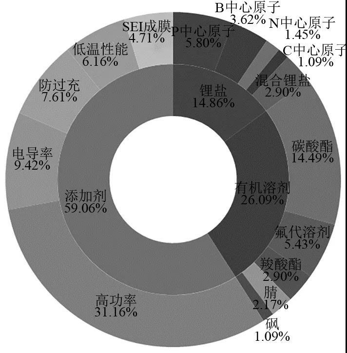 圖8為高功率電解液專利申請的技術(shù)分布,從圖中可以看出,添加劑領(lǐng)域的專利申請最多,占59.06%,其中與高功率相關(guān)的專利申請是添加劑專利申請的主體,占專利申請總量的31.16%;有機(jī)溶劑專利申請中碳酸酯專利申請的比例最高,其次為氟代溶劑;鋰鹽領(lǐng)域的專利申請量相對較少,占專利申請總量的14.86%。