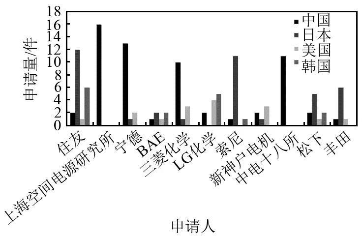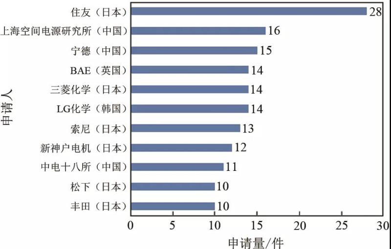 在基礎(chǔ)研究與技術(shù)發(fā)展的支持下,中國的高比特性高壓鋰離子電池技術(shù)已經(jīng)取得了長足的進(jìn)展,重要申請人的數(shù)量僅次于日本[8]。國內(nèi)的上??臻g電源研究所和中國電子科技集團(tuán)公司第十八研究所作為軍工企業(yè),在空間電源技術(shù)領(lǐng)域具有先進(jìn)的技術(shù)研發(fā)能力,寧德時代在動力和儲能電池領(lǐng)域,材料、電芯、電池系統(tǒng)等領(lǐng)域已經(jīng)達(dá)到國際先進(jìn)水平。