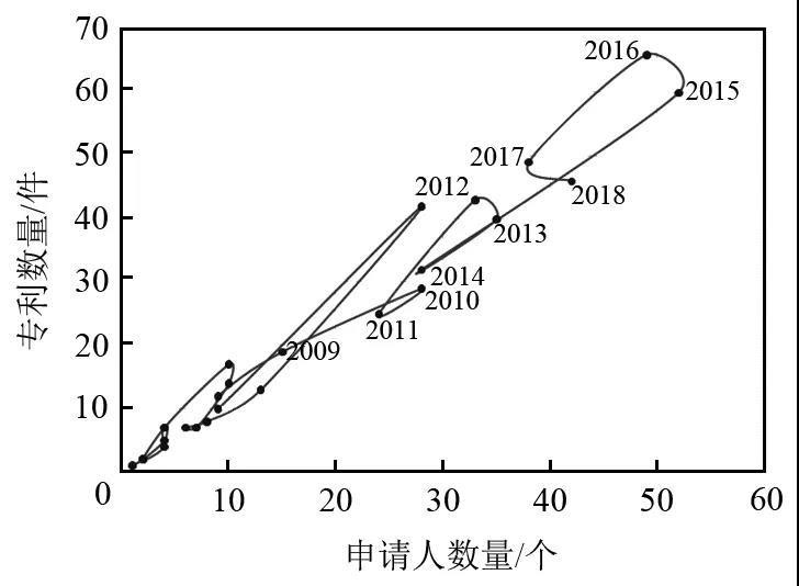 ,專利數(shù)量增長趨于穩(wěn)定,僅2014年申請人數(shù)量較前一年小幅回調(diào),不能說明總體申請人減少趨勢??傮w來看仍處于技術(shù)成長期。
