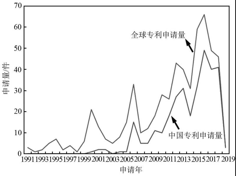 圖1為高比特性高壓鋰離子電池組專利年度申請趨勢,包括全球?qū)@暾堏厔莺椭袊鴮@暾堏厔?,通過專利申請趨勢能夠反映出高比特性高壓鋰離子電池組受關(guān)注程度以及技術(shù)發(fā)展趨勢。高比特性高壓鋰離子電池組的專利申請趨勢大致經(jīng)歷了3個主要階段。