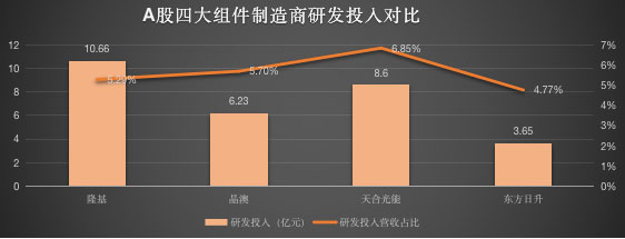 四家企業(yè)的綜合毛利率均有上升,相比之下,天合光能毛利率略遜一籌。但天合在研發(fā)投入上,可以說是四家企業(yè)中最重視的。